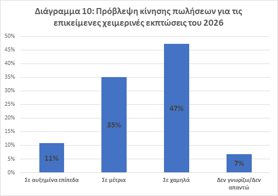 10. Οι πρόσφατες εξελίξεις καθιστούν τις επιχειρήσεις μάλλον συγκρατημένες αναφορικά με τις προβλέψεις τους για τις πωλήσεις κατά τη διάρκεια των χειμερινών εκπτώσεων του 2026 (Διάγραμμα 10). Οι μισές επιχειρήσεις (47%) αναμένουν τις πωλήσεις τους να κινηθούν σε χαμηλά επίπεδα ενώ 1 στις 3 (35%) σε μέτρια.