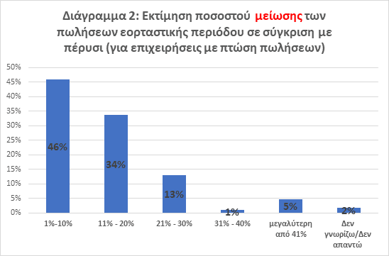 2. Στις επιχειρήσεις που πραγματοποίησαν χαμηλότερες πωλήσεις κατά τη φετινή εορταστική περίοδο, το 46% δήλωσε μείωση έως 10%, και 1 στις 3 (34%) δήλωσε πτώση τζίρου από 11% έως 20% (Διάγραμμα 2). Αυτό σημαίνει πως, με αναγωγή επί του συνόλου των επιχειρήσεων του δείγματος της Έρευνας, 4 στις 10 (42%) δήλωσαν μείωση τζίρου έως και 20%.