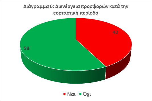 6. Η μείωση του πραγματικού διαθέσιμου εισοδήματος, σε συνδυασμό με το αυξημένο λειτουργικό κόστος και την αβεβαιότητα, ανάγκασε 4 στις 10 επιχειρήσεις (42%) να πραγματοποιήσουν προσφορές/εκπτώσεις κατά τη διάρκεια της εορταστικής περιόδου (Διάγραμμα 6). Ειδικότερα, το 48% των επιχειρήσεων που προχώρησαν σε εκπτώσεις, μειώνοντας τις τιμές των προϊόντων τους από 11% έως 20%.