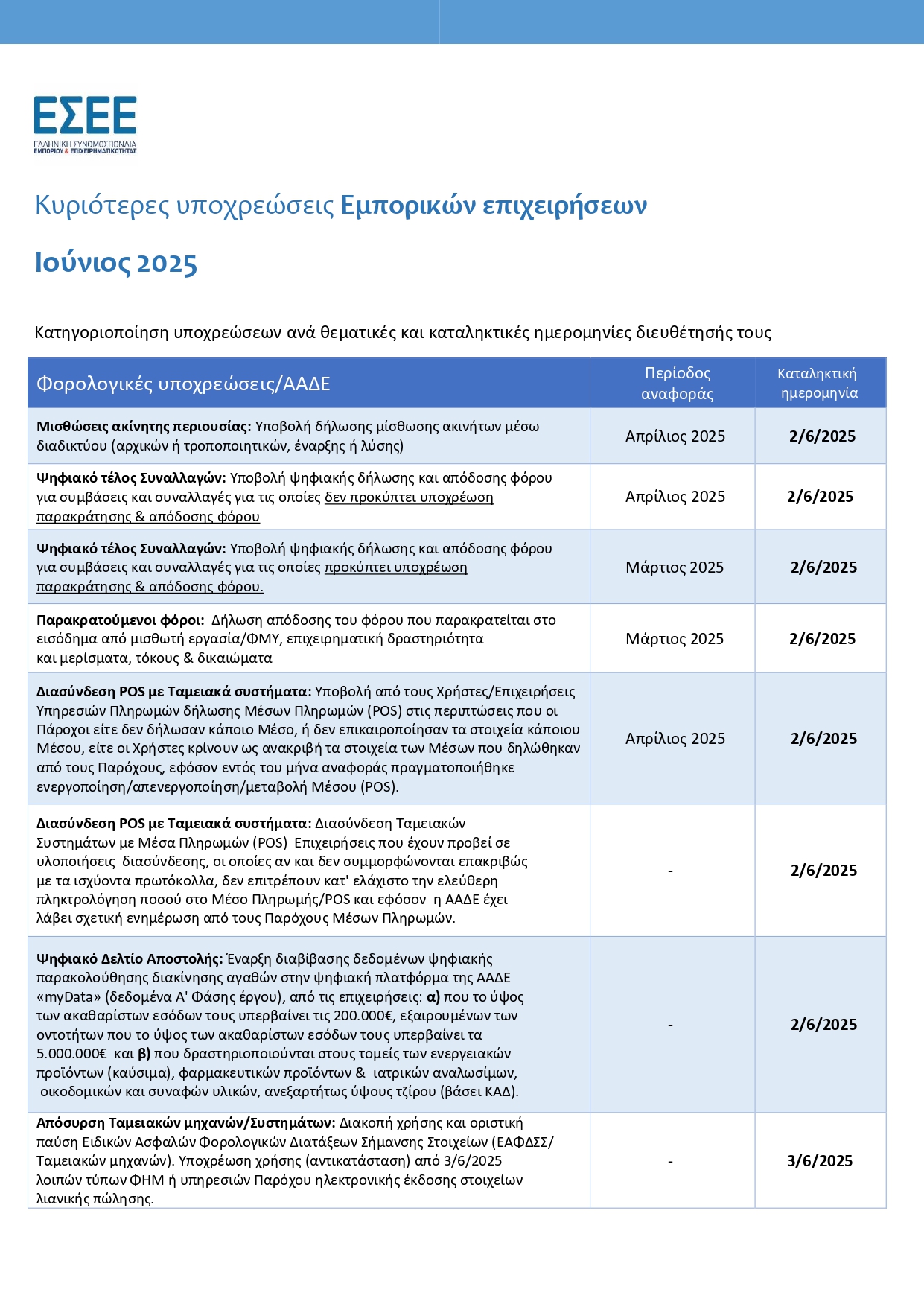 Κυριότερες υποχρεώσεις εμπορικών επιχειρήσεων - Ιούνιος 2025