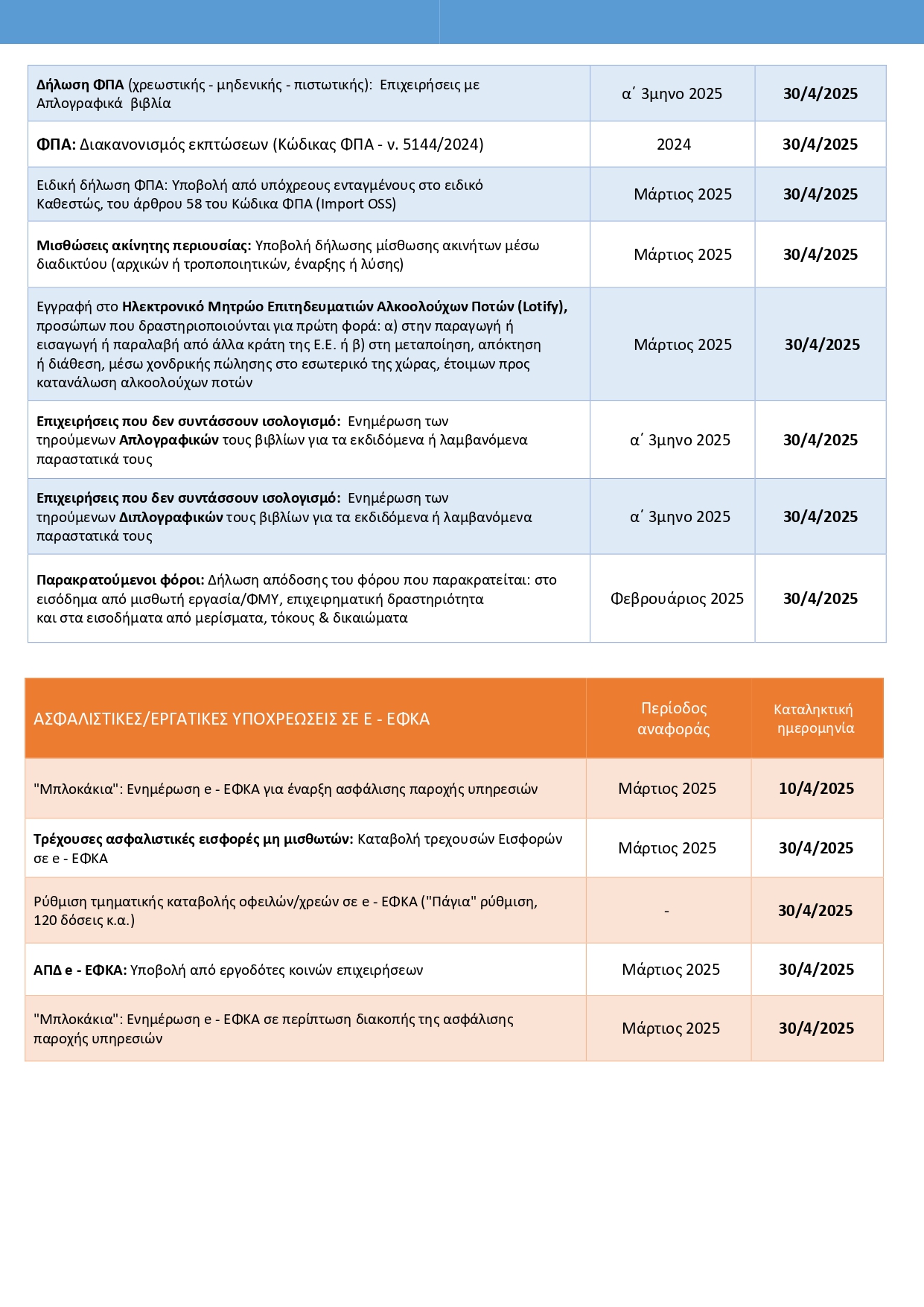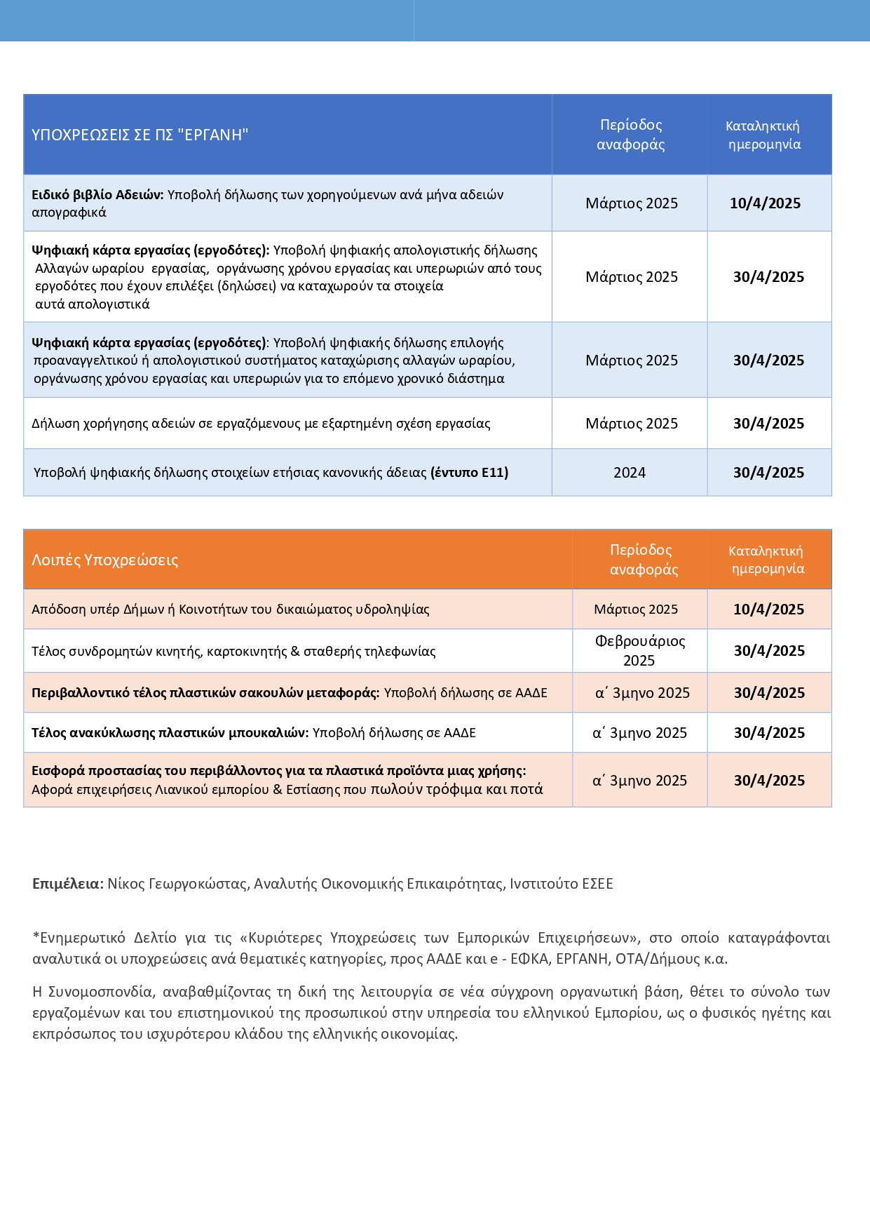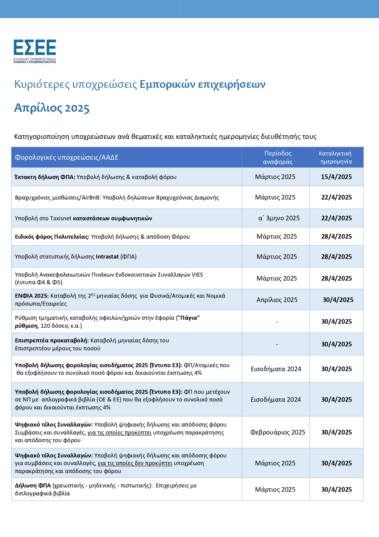 Στο παρόν Ενημερωτικό Δελτίο για τις Κυριότερες Υποχρεώσεις των Εμπορικών Επιχειρήσεων, καταγράφονται αναλυτικά, ανά θεματικές κατηγορίες, οι υποχρεώσεις προς ΑΑΔΕ και e-ΕΦΚΑ, ΕΡΓΑΝΗ, ΟΤΑ/Δήμους κ.ά. Επιπλέον, αναφέρονται οι καταληκτικές ημερομηνίες διευθέτησής τους.
