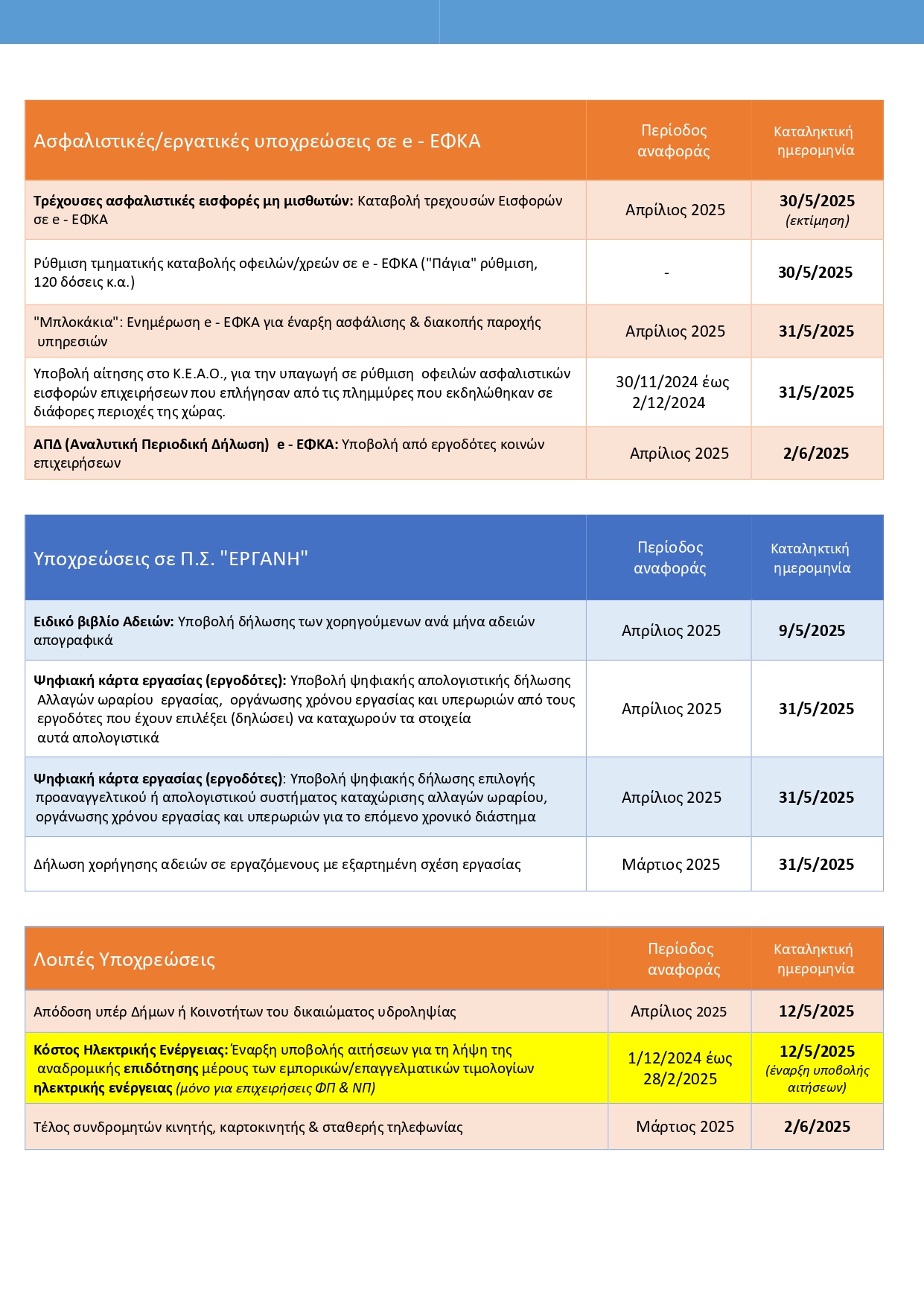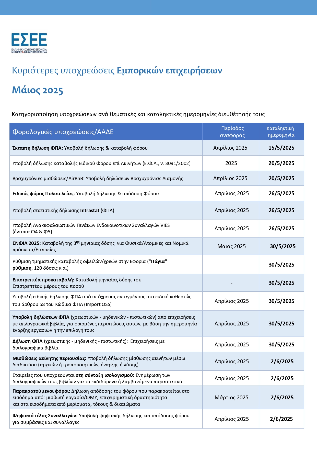 Στο παρόν Ενημερωτικό Δελτίο για τις Κυριότερες Υποχρεώσεις των Εμπορικών Επιχειρήσεων τον μήνα Μάιο, καταγράφονται αναλυτικά, ανά θεματικές κατηγορίες, οι υποχρεώσεις προς ΑΑΔΕ και e-ΕΦΚΑ, ΕΡΓΑΝΗ, ΟΤΑ/Δήμους κ.ά. Επιπλέον, αναφέρονται οι καταληκτικές ημερομηνίες διευθέτησής τους.